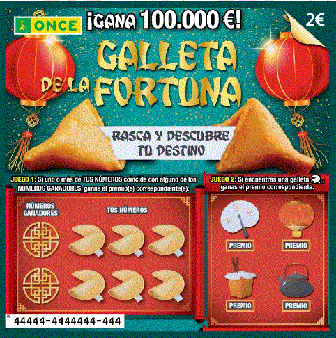 Prueba la suerte con el rasca "Galleta de la Fortuna" de la ONCE, un divertido rasca inspirado en el lejano Oriente que por solo 2€ te da la oportunidad de ganar hasta 100.000€. Con dos áreas de juego distintas, cada rascada es una posibilidad de fortuna con varias posibilidades de premios.